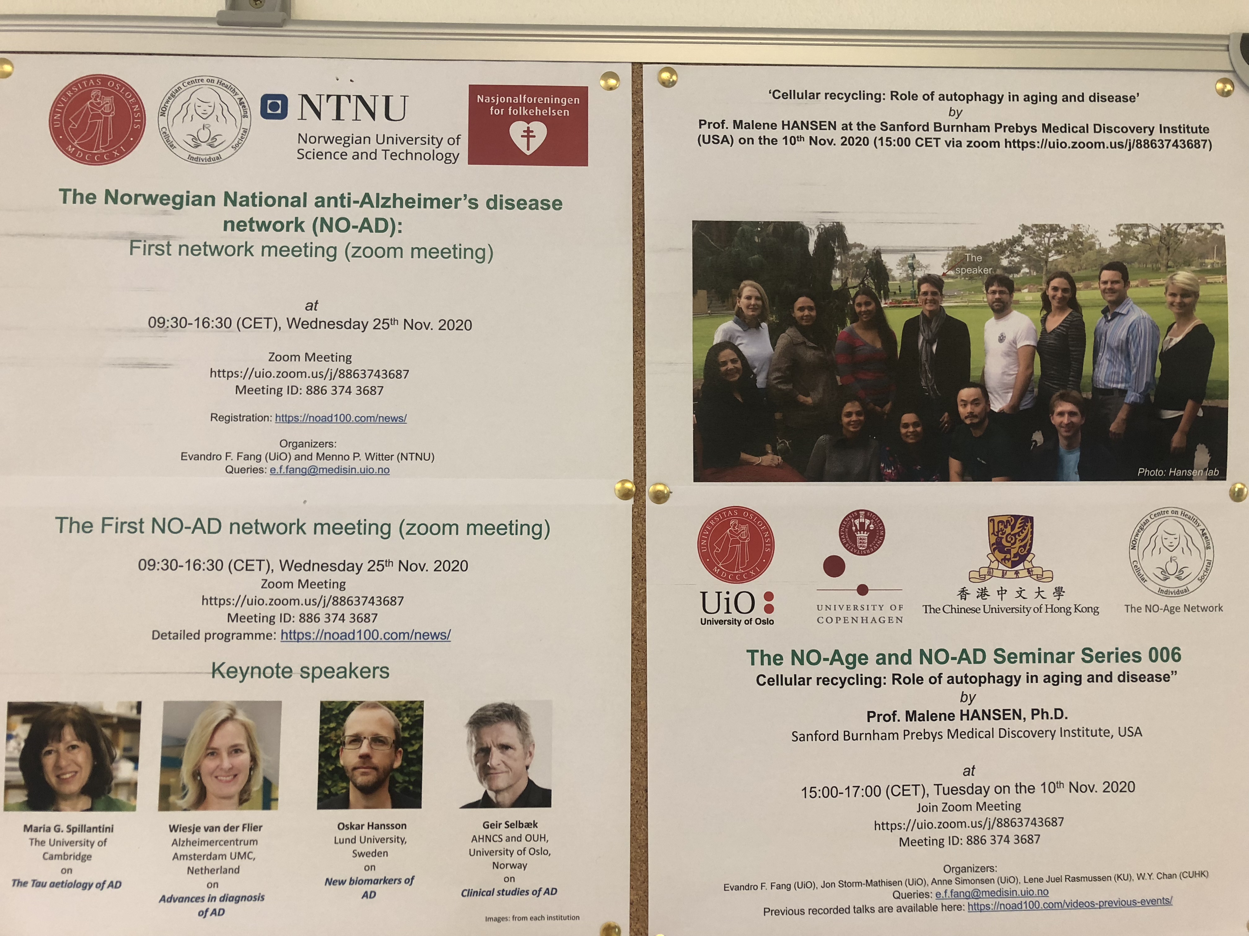Welcome to attend our NO-Age (Norwegian Centre on Healthy Ageing Network) and NO-AD Seminar Series. The Series are joint-organized by the University of Oslo (UiO), the University of Copenhagen (KU), the Chinese University of Hong Kong (CUHK) based on the established Hong Kong Nordic Research Network (https://noage100.com/the-hong-kong-nordic-research-network/), as well as the NO-Age (www.noage100.com) and the NO-AD (www.noad100.com), two Norway-based international networks. NTNU (Norway) and its affiliated two centres, the K.G. Jebsen Centre for Alzheimer´s Disease and the Kavli Institute for Systems Neuroscience, joined in later as co-organizers.