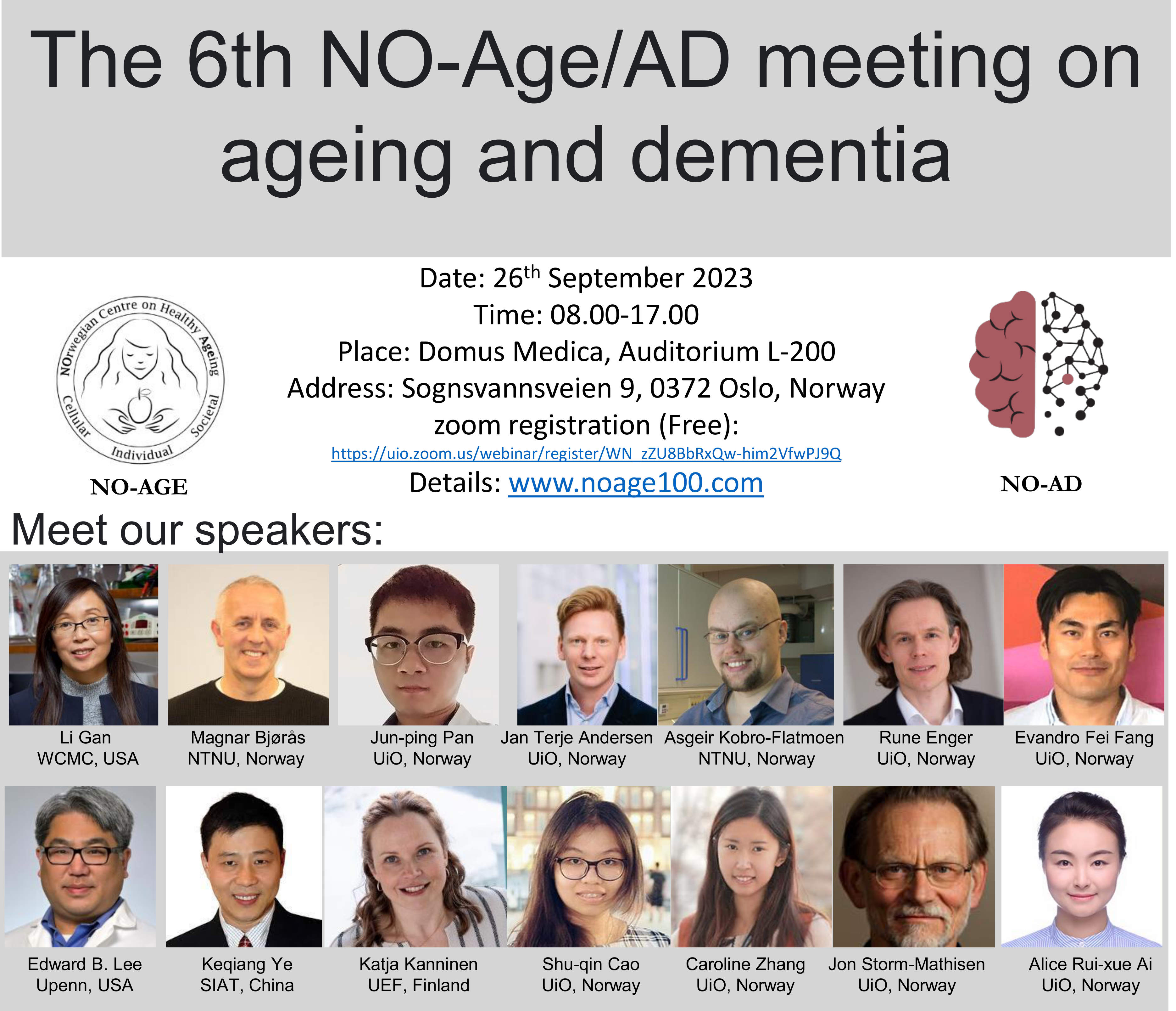 | 2023.09.26 (Moved from Monday to Tuesday) | The NO-Age and NO-AD Seminar Series 069 (in person and zoom meeting) 14:00 – 15:15 (CET): ‘The good, the bad, and the ugly: how tau becomes toxic?’ by Prof. Li Gan, Director, Helen and Robert Appel Alzheimer Disease Research Institute, Brain and Mind Research Institute, Weill Cornell Medicine, USA (lig2033@med.cornell.edu). 15:15-16:30 (CET): ‘Untangling Neurodegeneration: From Pathology to Pathophysiology’ by Prof. Edward B. Lee, M.D., Ph.D, Co-Director, Institute on Aging, University of Pennsylvania, USA (Edward.Lee@pennmedicine.upenn.edu) Room: Domus Medica, Auditorium L-200 (Address: Sognsvannsveien 9, 0372 Oslo) booked by EFF Flyer Video1 Video2 |