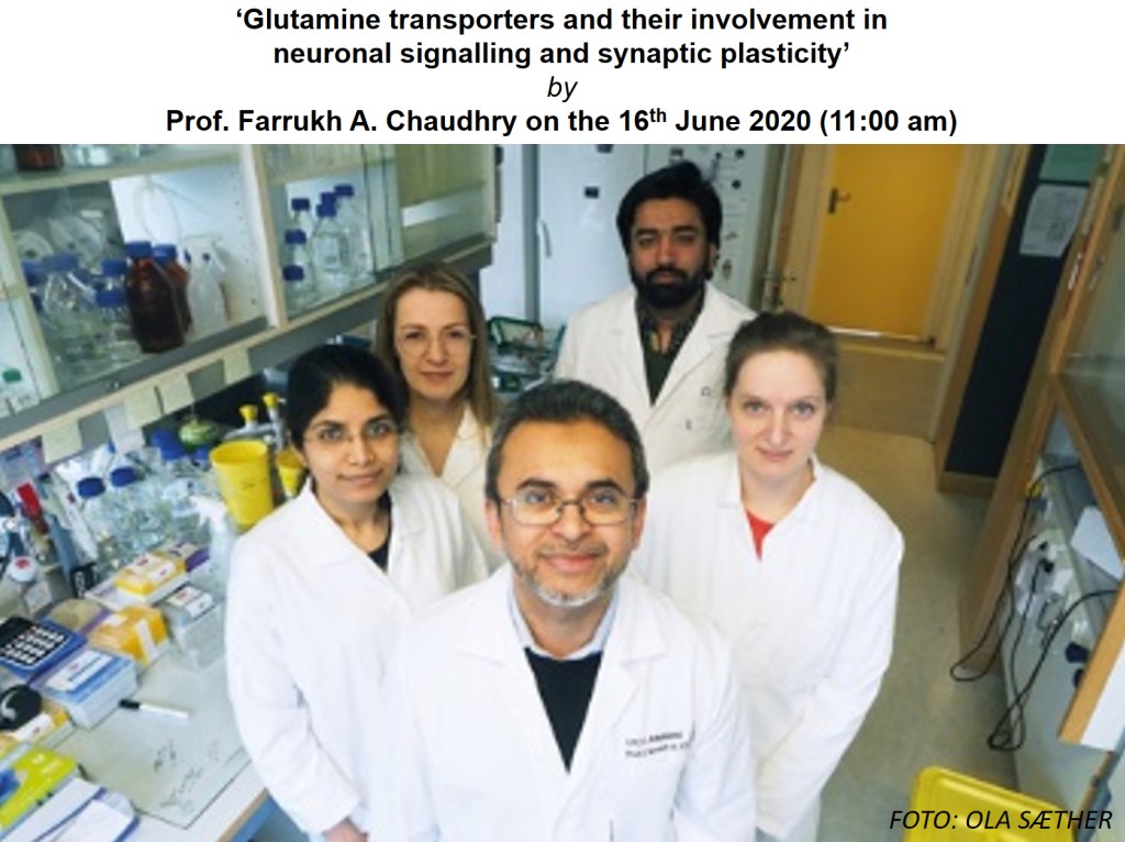 16th June 2020: Lecture by Prof. Farrukh A. Chaudhry on ‘Glutamine transporters and their involvement in neuronal signalling and synaptic plasticity’, The University of Oslo, Oslo, Norway.