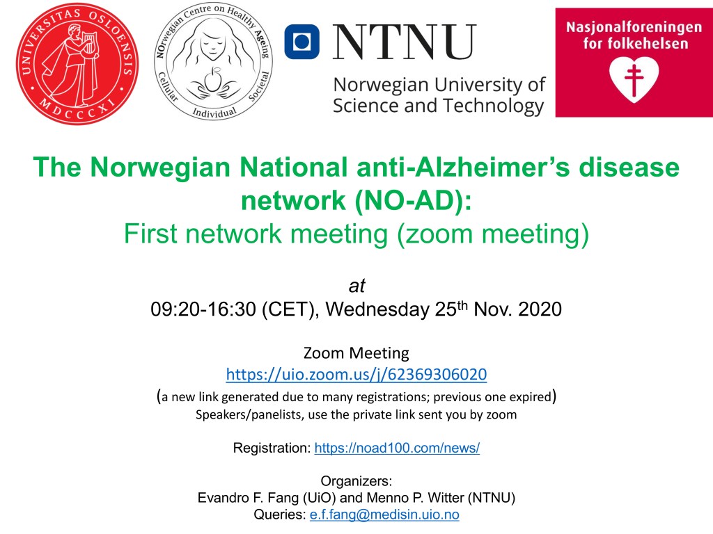 25th Nov 2020: The 1st NO/AD network meeting features 4 key note speakers with topics covering molecular mechanisms, clinical treatment, biomarkers, and longitudinal cohorts, as well as short talks from 36 laboratories in Norway.