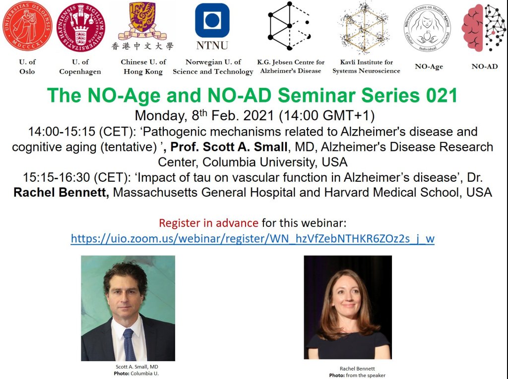 08th Feb 2021: The NO-Age and NO-AD Seminar Series 021: ‘Anatomical Biology as a Key into Alzheimer’s Disease and Cognitive Aging’, by Prof. Scott A. Small, Columbia University, and ‘Impact of tau on vascular function in Alzheimer’s disease’ by Dr. Rachel Bennett, Massachusetts General Hospital and Harvard Medical School, USA