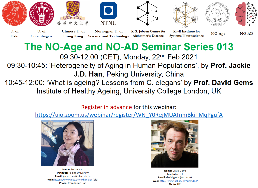 22nd Feb 2021: Lectures by Profs. Jackie Han on ‘Heterogeneity of Aging in human population’ and David Gems on ‘What is ageing? Lessons from C. elegans’.