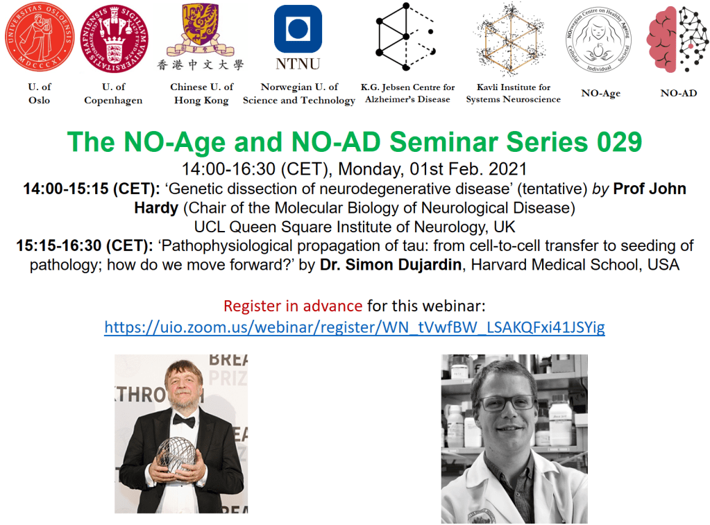01st Feb 2021: The NO-Age and NO-AD Seminar Series 029: ‘Genetic dissection of neurodegenerative disease’ (tentative) by Prof John Hardy (Chair of the Molecular Biology of Neurological Disease) UCL Queen Square Institute of Neurology, UK; and ‘Pathophysiological propagation of tau: from cell-to-cell transfer to seeding of pathology; how do we move forward?’ by Dr. Simon Dujardin, Harvard Medical School, USA