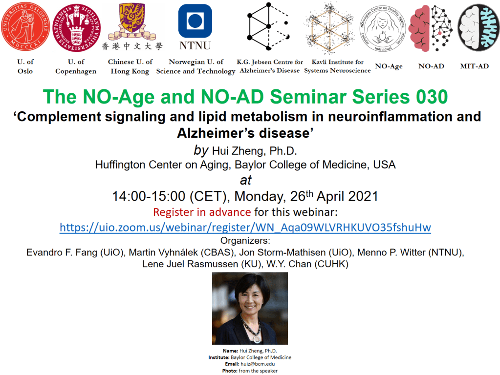 26th April 2021: ‘Complement signaling and lipid metabolism in neuroinflammation and Alzheimer’s disease’ by Prof. Hui Zheng, Baylor College of Medicine, USA