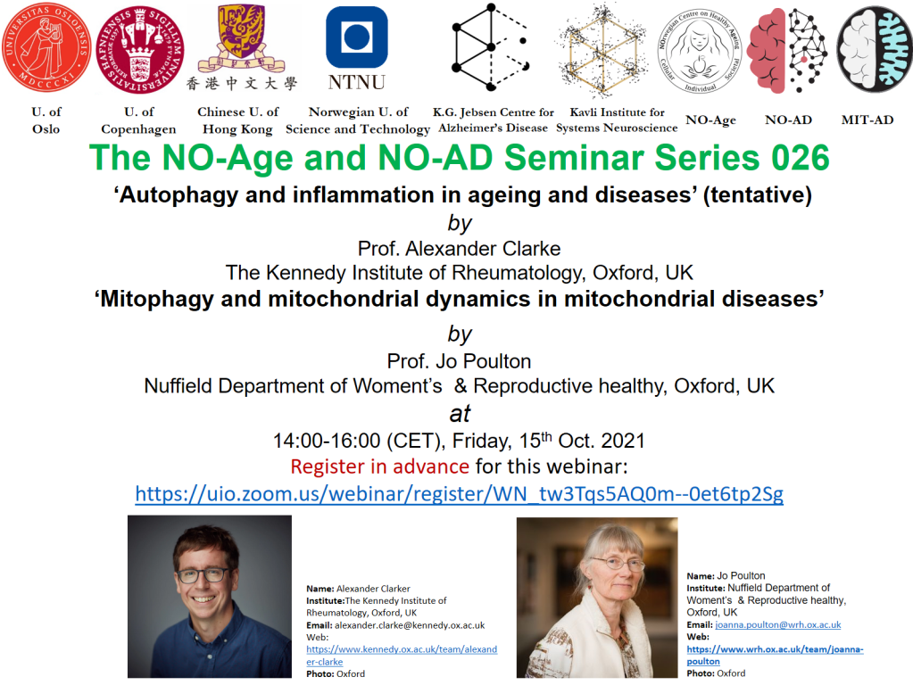 15th Oct 2021: ‘Autophagy and inflammation in ageing and diseases’ by Prof. Alexander Clarke, The Kennedy Institute of Rheumatology, Oxford, UK. ‘Mitophagy and mitochondrial dynamics in mitochondrial diseases’ by Jo Poulton, Nuffield Department of Woment’s & Reproductive healthy, Oxford, UK