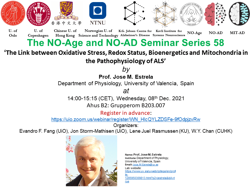 8th Dec 2021:‘ The Link between Oxidative Stress, Redox Status, Bioenergetics and Mitochondria in the Pathophysiology of ALS‘ by Prof. Jose M. Estrela, Department of Physiology, University of Valencia, Spain