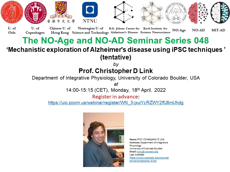 18th April 2022: ‘Mechanistic exploration of Alzheimer’s disease using iPSC techniques’ by Prof. Christopher D Link, University of Colorado, USA