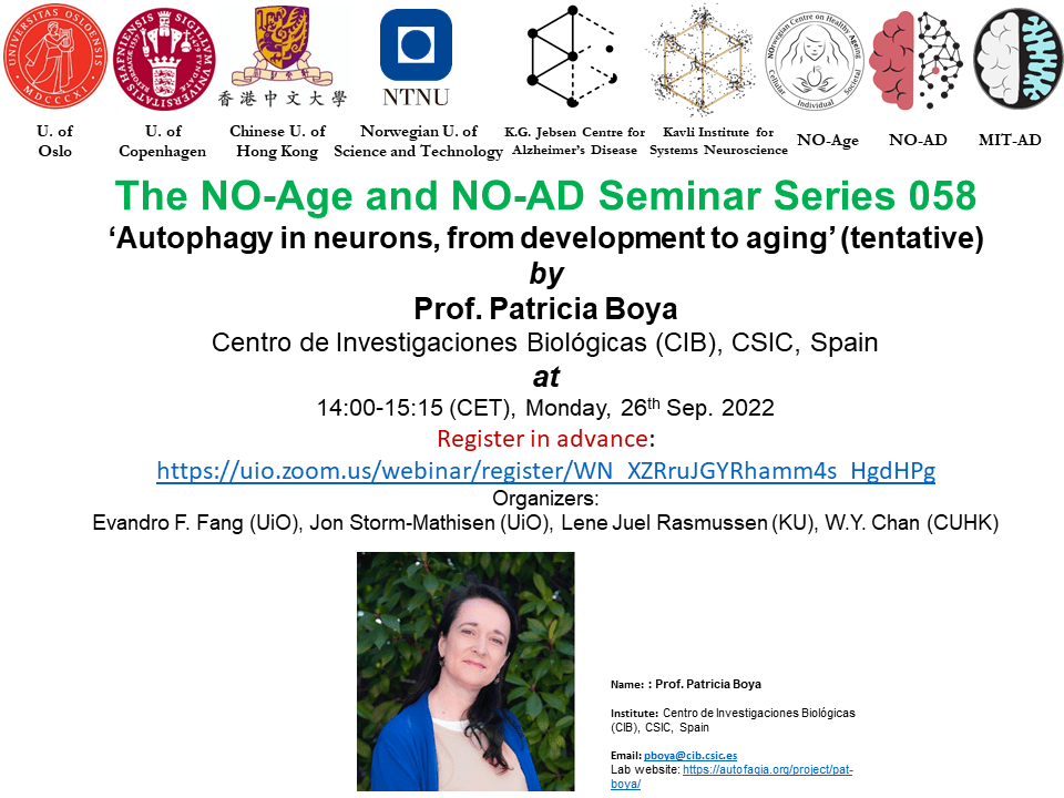 26th Sep 2022:’Autophagy in neurons, from development of aging’ by Prof. Patricia Boya, Centro de Investigaciones Biologicas (CIB), CSIC, Spain