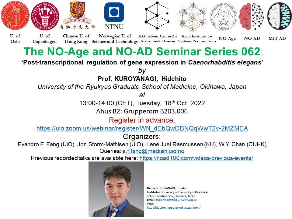 18th Oct 2022: ‘Post-transcriptional regulation of gene expression in Caenorhabditis elegans’ by Prof. KUROYANAGI, Hidehito, University of the Ryukyus Graduate School of Medicine, Okinawa, Japan