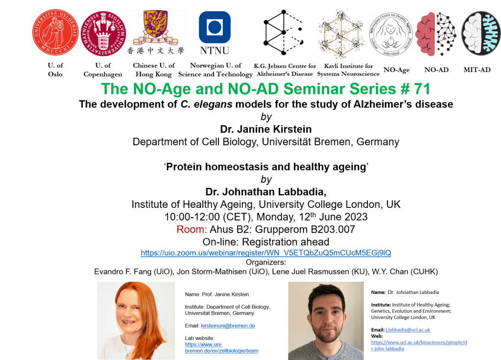 12th June 2023: ‘The development of C. elegans models for the study of Alzheimer’s disease’ by Dr. Janine Kirstein. ‘Protein homeostasis and healthy ageing’ by Dr. Johnathan Labbadia