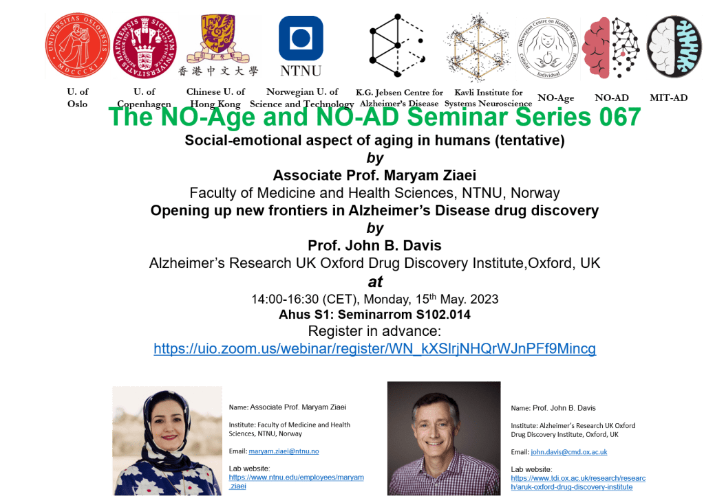 15th May 2023: ‘Social-emotional aspect of aging in humans’ by Associate Prof. Maryam Ziaei. ‘Opening up new frontiers in Alzheimer’s Disease drug discovery’ by Prof. John B. Davis