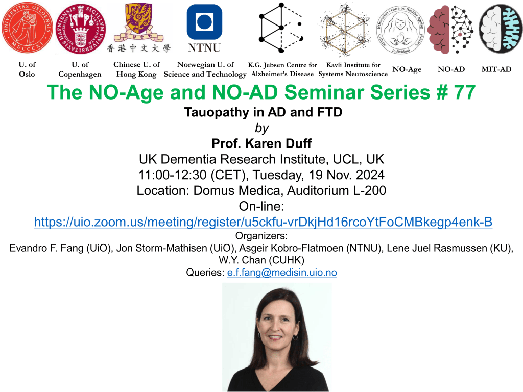 19th Nov 2024: Tauophagy in AD and FTD by Prof. Karen Duff from UK Dementia Research Institute, UCL, UK