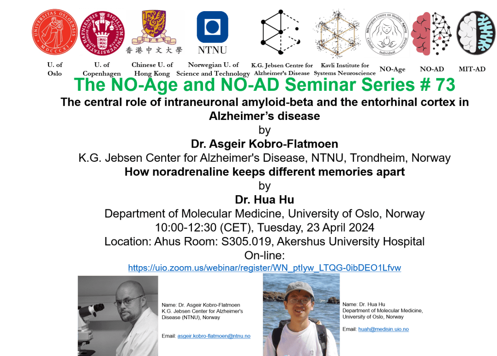 23th April. 2024: ‘The central role of intraneuronal amyloid-beta and the entorhinal cortex in Alzheimer’s disease’ by Dr. Asgeir Kobro-Flatmoe. ‘How Noradrenaline Keeps Different Memories Apart’ by Dr. Hua Hu